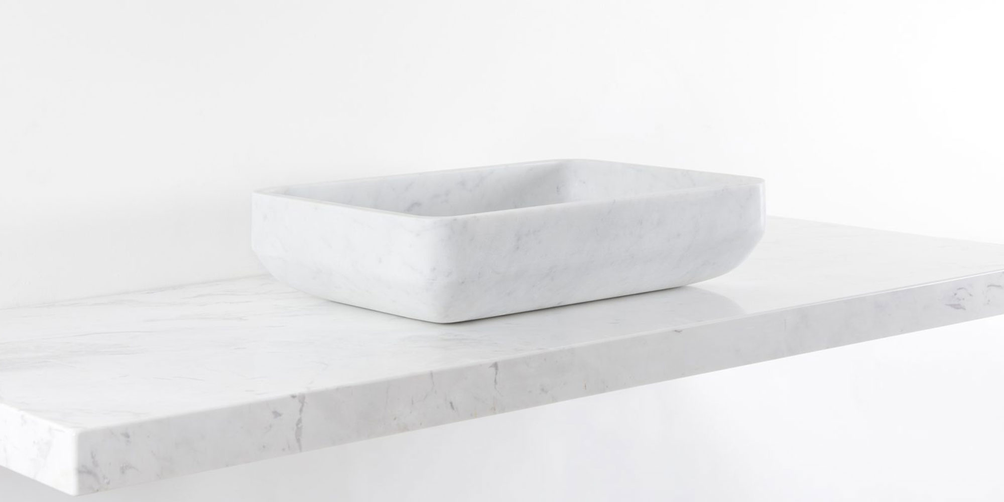 Clean and contemporary, the stunning white Vaba Carrara Basin is one of our most sought-after designs. Carved from a block of Bianco Carrara White Marble, this exquisite rectangular rounded bechtop basin features a bright white base with soft grey nuances and subtle veining.