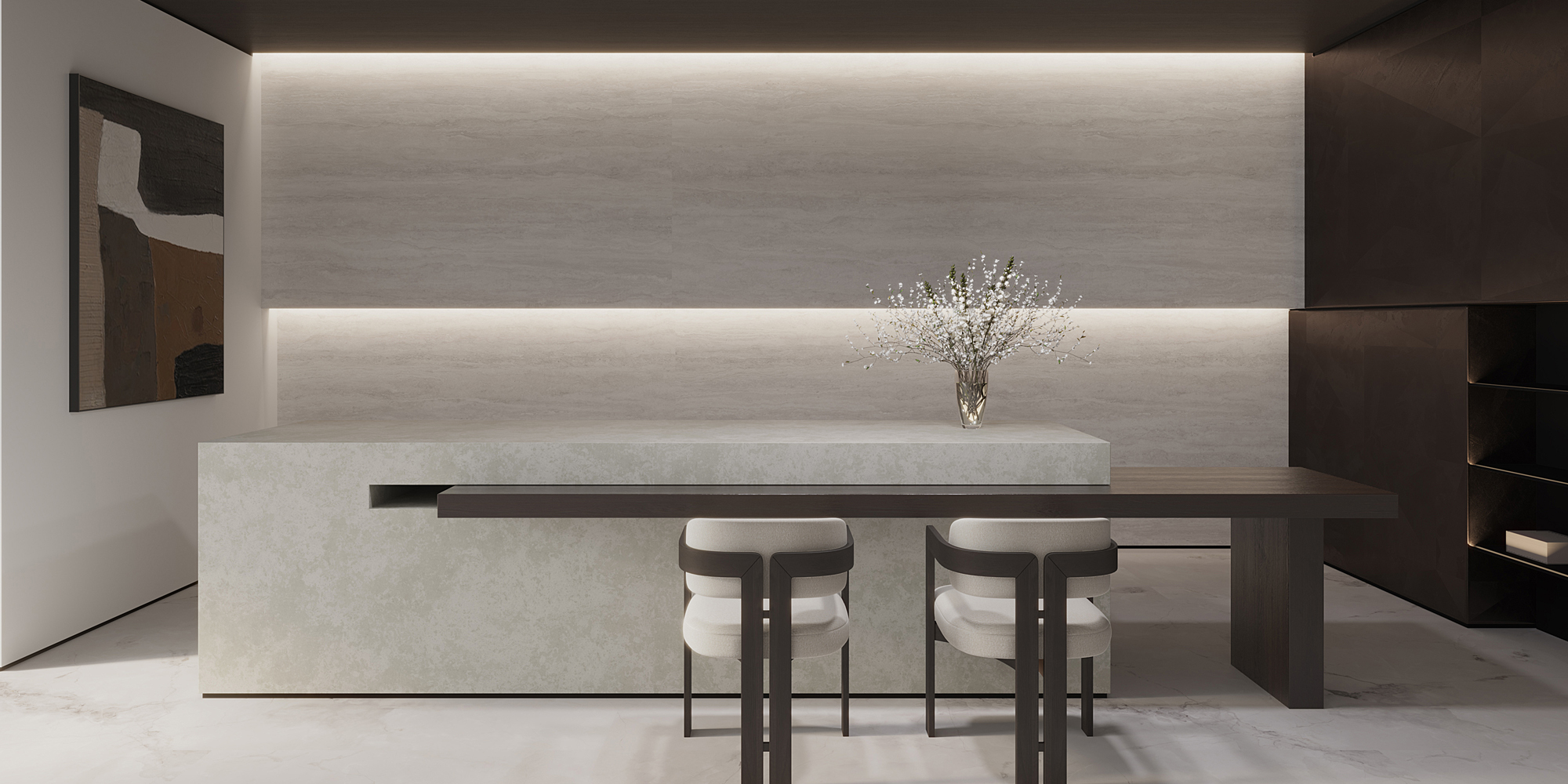 - A serene, vein-free alternative to traditional marble-inspired stones