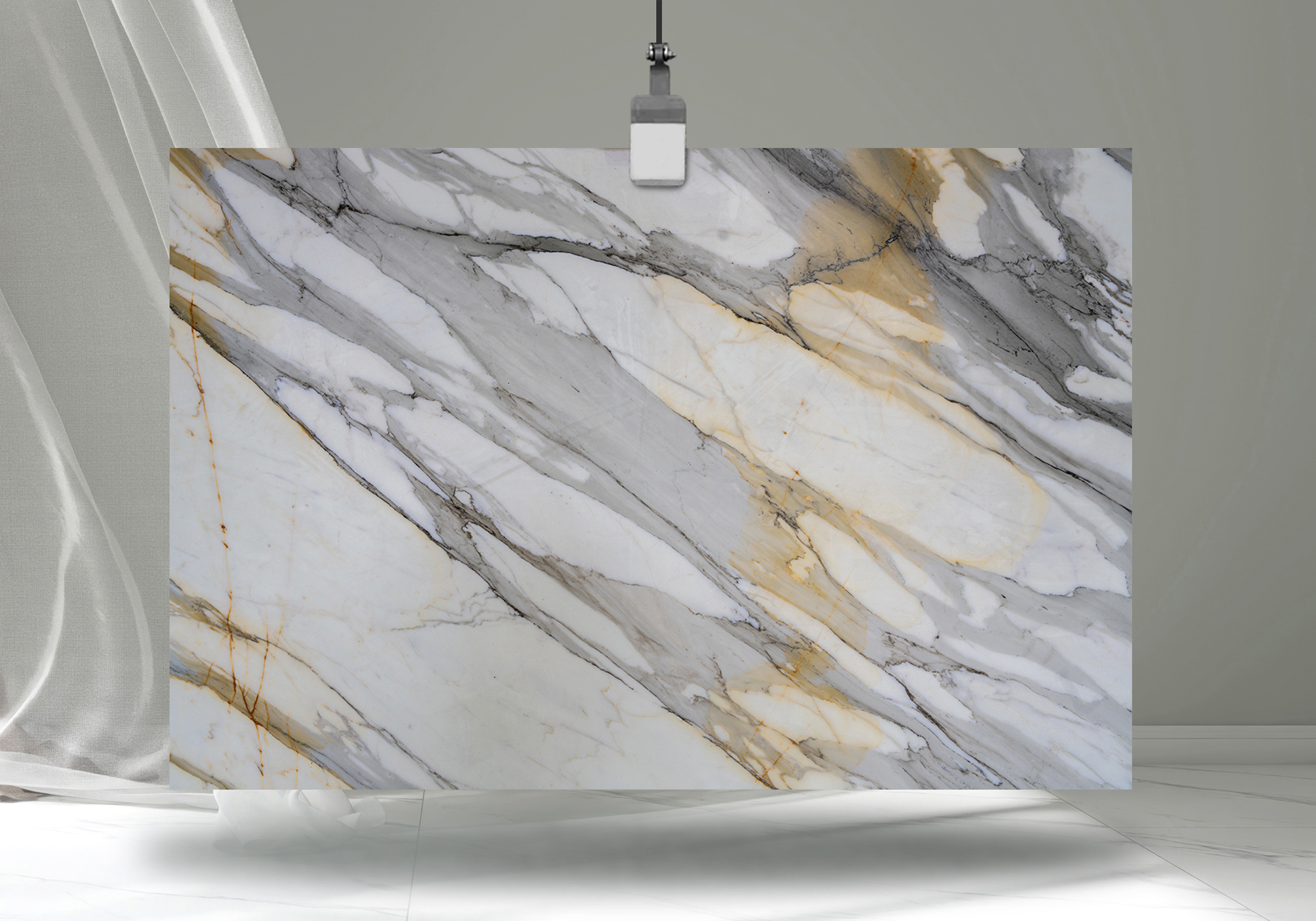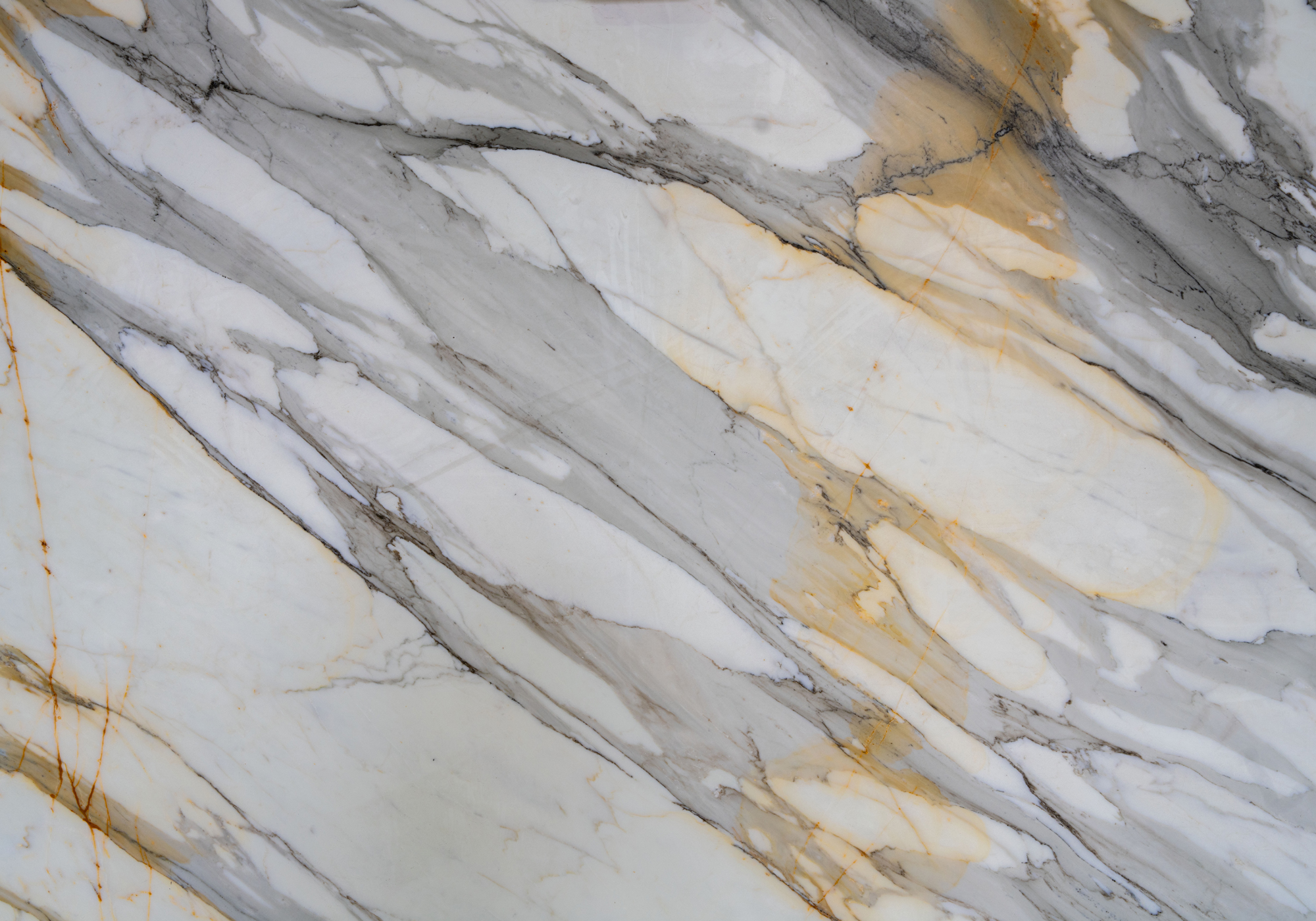 - Contemporary interpretation of classic Calacatta with off-white undertones and flowing grey veining accented by hints of brown and charcoal
