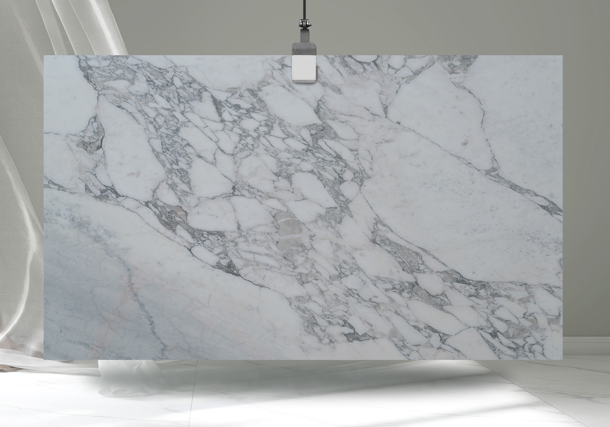 As shown in this Honed slab, the marble features a brilliant, crisp white foundation, distinguishing it from other white Calacatta varieties. The surface is powerfully traversed by bold, fractured veins of dark grey and deep charcoal, creating a visually commanding and high-contrast composition. This elegant, honed finish provides a sophisticated, low-sheen matte look that softens the sharp contrast of the veining and is perfect for achieving a luxurious, gallery-like aesthetic in benchtops, walls, and feature panels in both classic and contemporary settings.