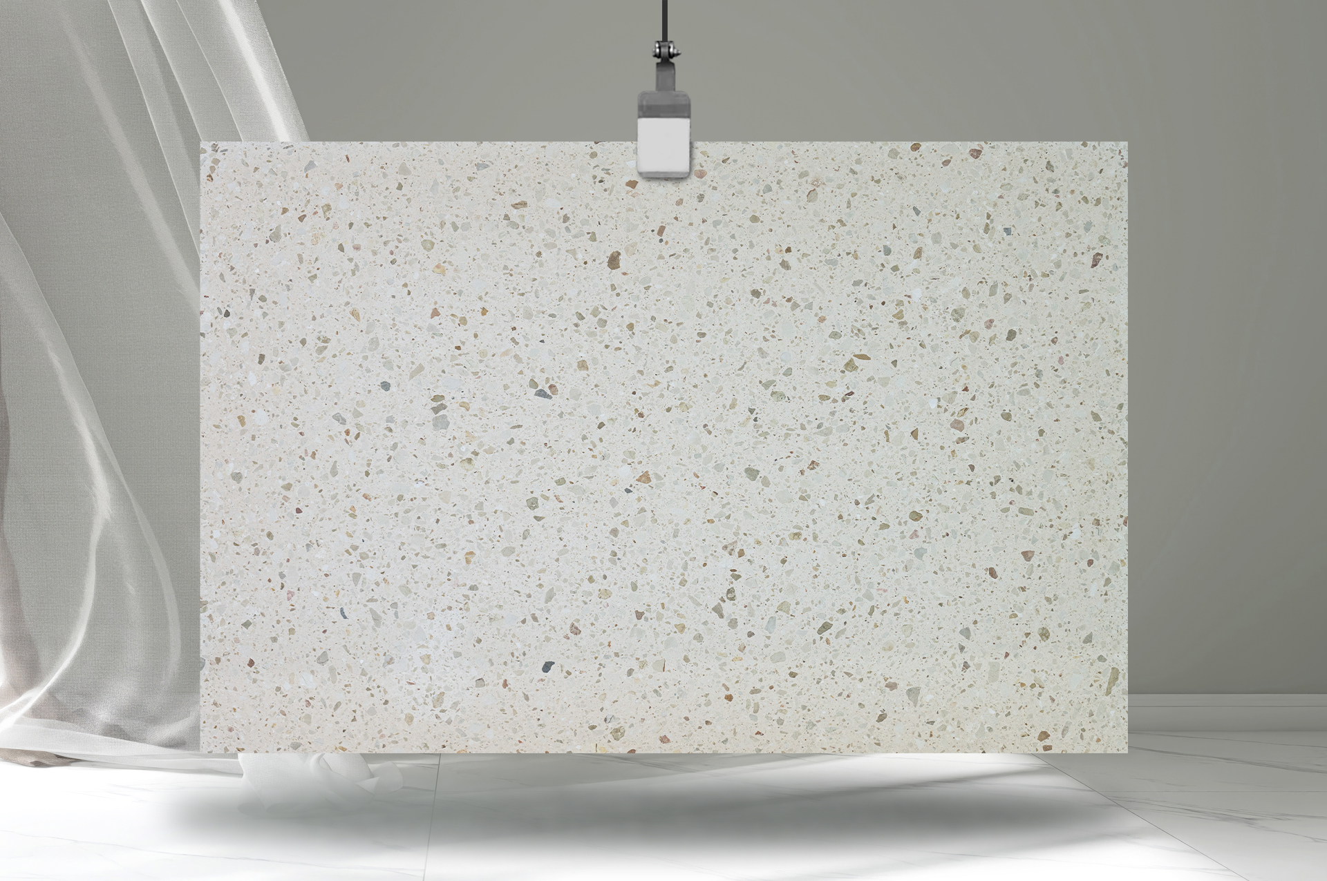 - Honed to a soft-touch matte finish that enhances its gentle, organic terrazzo character