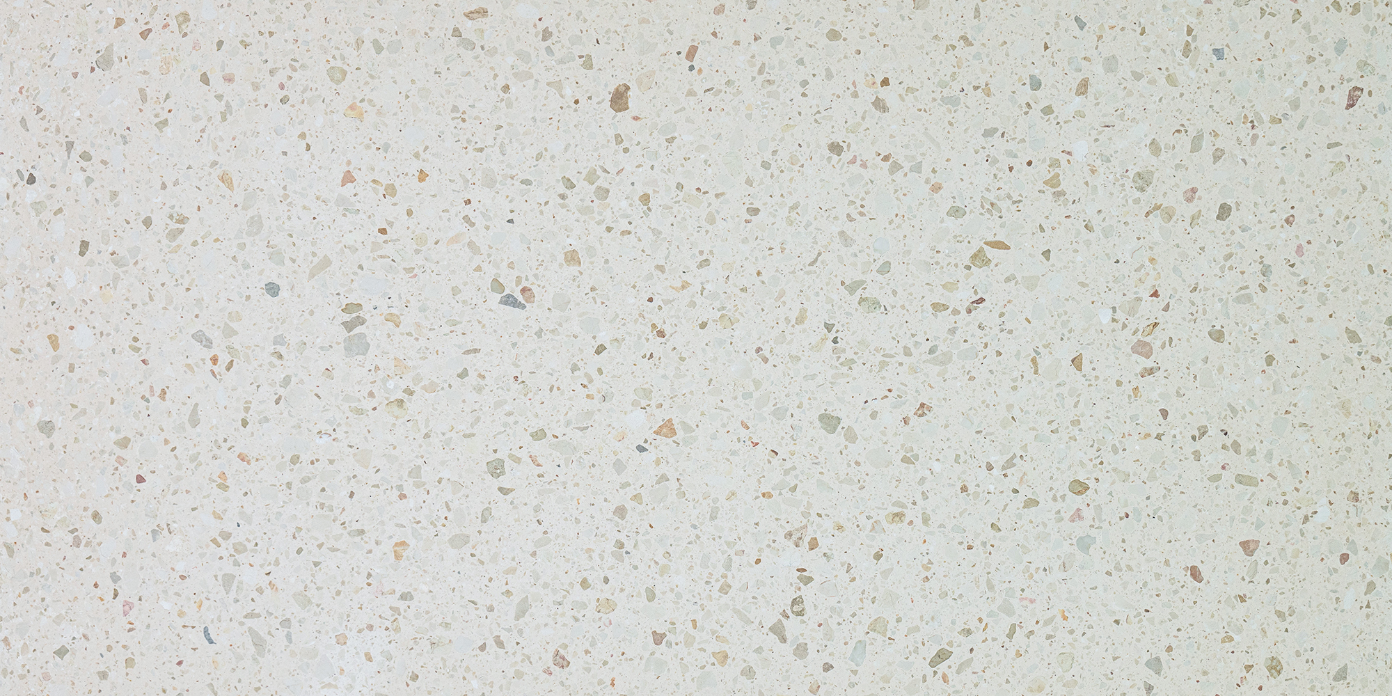 A warm beige base dotted with ivory, blush and muted olive aggregates, honed to a soft‑touch finish that underscores its subtle, natural terrazzo charm.