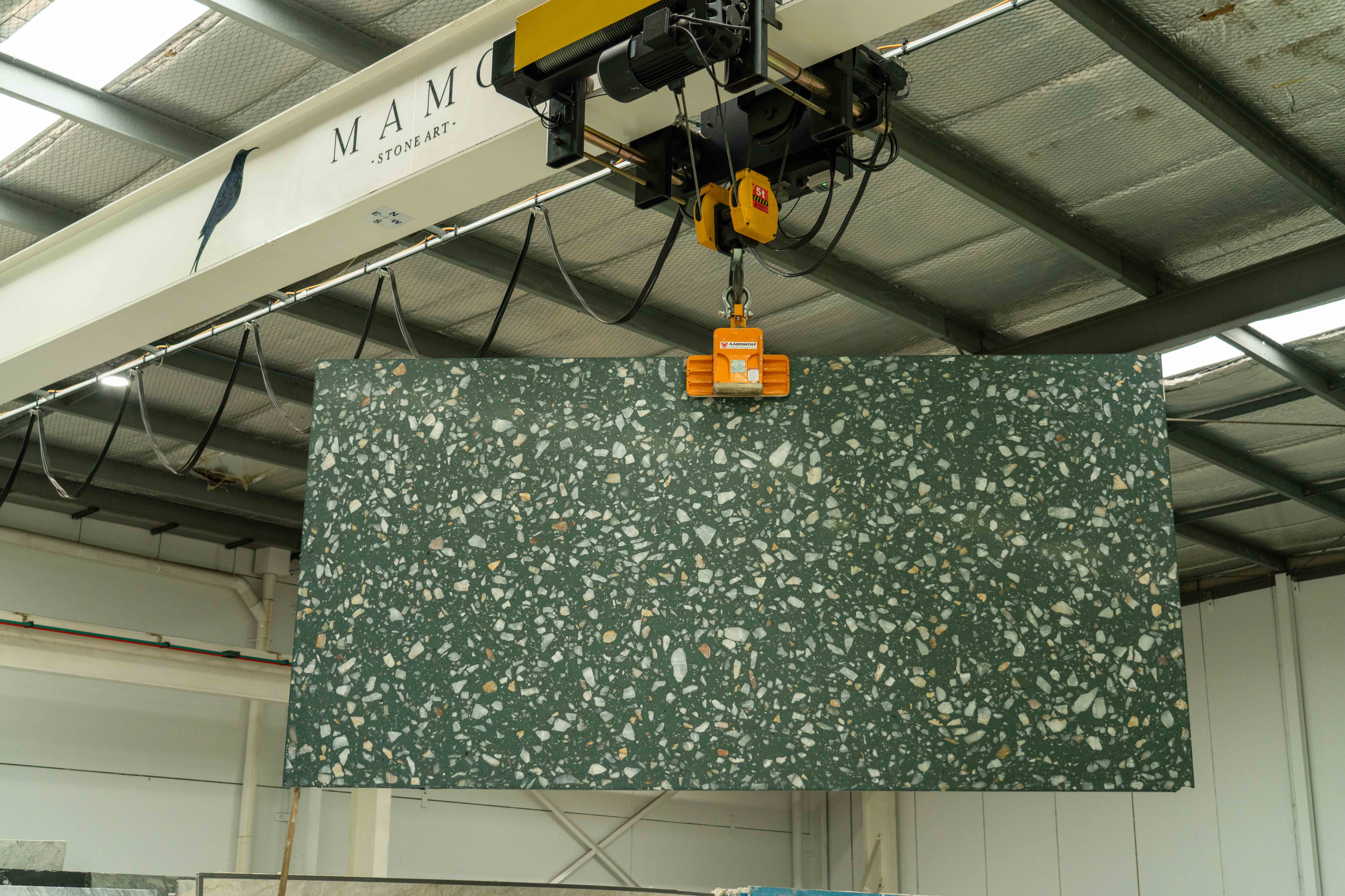 Kiwi Krunch is a vibrant terrazzo surface characterised by a deep green base layered with a lively mix of crystalline aggregates. Translucent white quartz fragments and warm mineral accents create a dynamic, organic composition that feels both fresh and grounded.