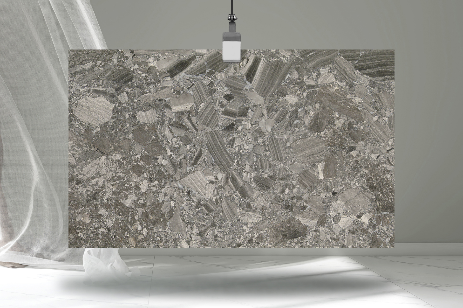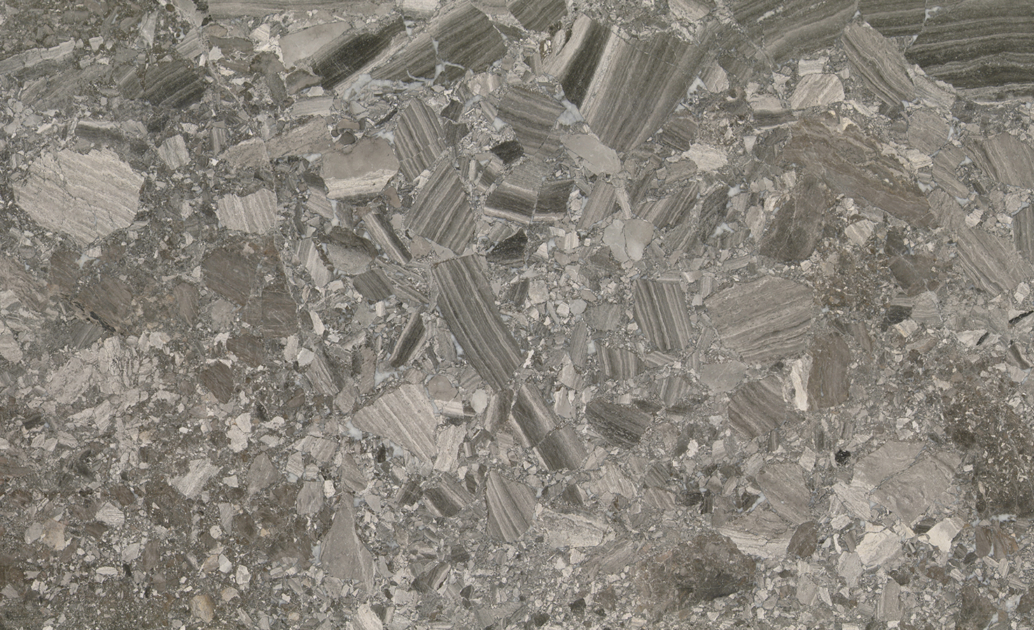 Minerva presents a striking visual symphony of lithic fragments. Characterized by an intricate interplay of grey and earthy bronze clasts, it offers a sophisticated natural mosaic aesthetic. The internal parallel lamination within each fragment is preserved, yet reoriented through natural fracturing to create a multidirectional rhythm. This unique composition provides the slab with extraordinary kinetic energy and a deep, architectural layering.