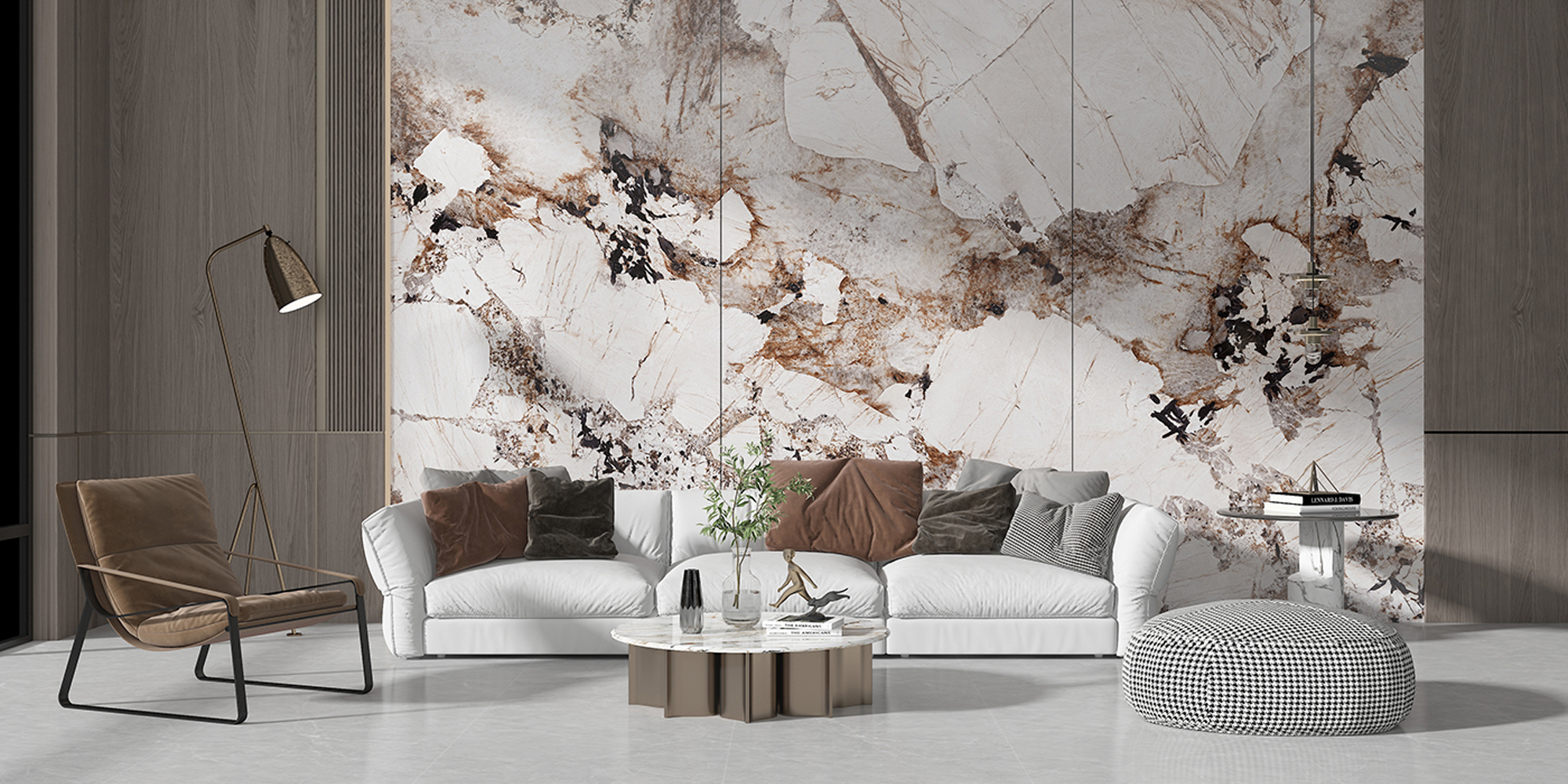 - Sophisticated blend of white, cream and earthy mineral tones with intricate natural veining and organic inclusions