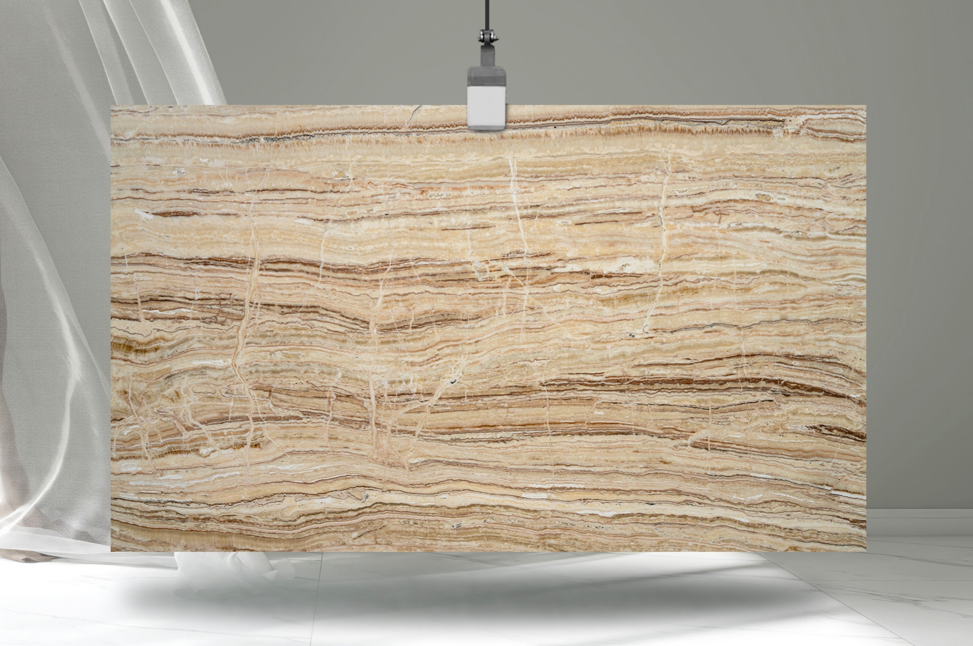 Formed over millennia in the quarries of Iran, Travertine Onyx is admired for its serene palette of cream, beige, and honeyed caramel tones. Its naturally layered bands create a gentle sense of rhythm and movement, offering warmth and sophistication to any interior. The soft honed surface enhances its organic depth, making it a beautiful choice for feature walls, benchtops, and statement spaces seeking timeless elegance.