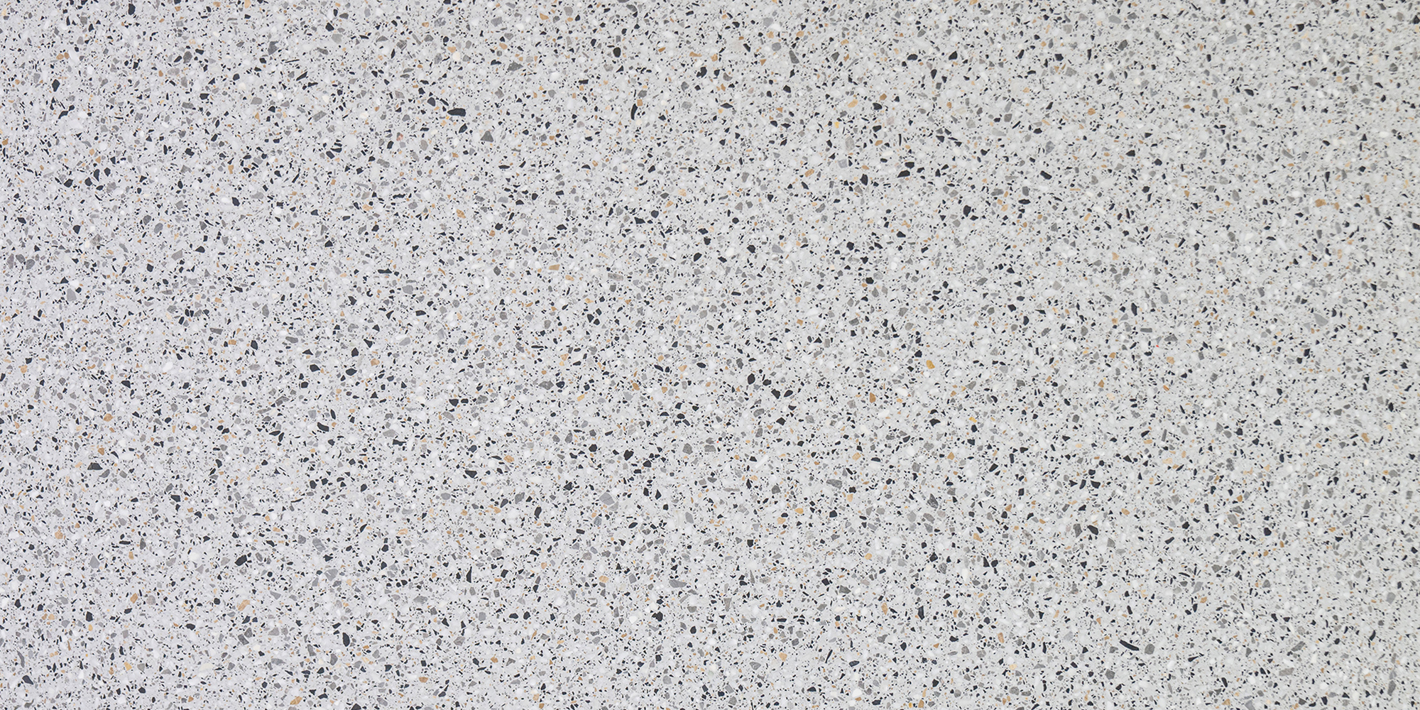 - Cool grey terrazzo base with bold black, amber and white natural-stone aggregates for refined contrast